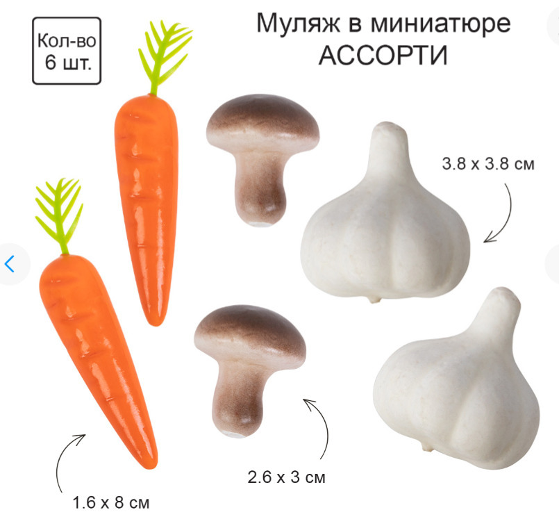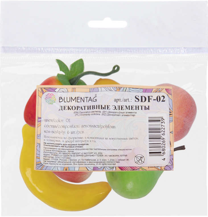 Муляж в миниатюре "Ассорти" "Blumentag" SDF-02 в виде ярких фруктов, овощей и ягод — используется во флористике, в композициях из искусственных цветов, в букетах из конфет, в топиариях, в декоре интерьера. Прекрасно подойдет в качестве самостоятельного аксессуара или украшения для домашней кухни, витрин магазинов, ресторанов и кафе.