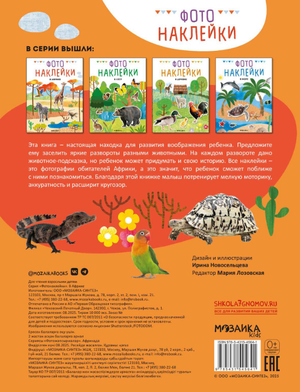 Книга «В Африке» серии «Фотонаклейки» – настоящая находка для развития воображения ребенка. Яркие страницы с коллажными иллюстрациями нужно заполнить разными животными. На каждом развороте дано животное-подсказка, но ребенок может придумать и свою историю. Все наклейки – это фотографии обитателей Африки, а это значит, что ребенок сможет поближе с ними познакомиться. Благодаря этой книжке малыш потренирует мелкую моторику, аккуратность и расширит кругозор.