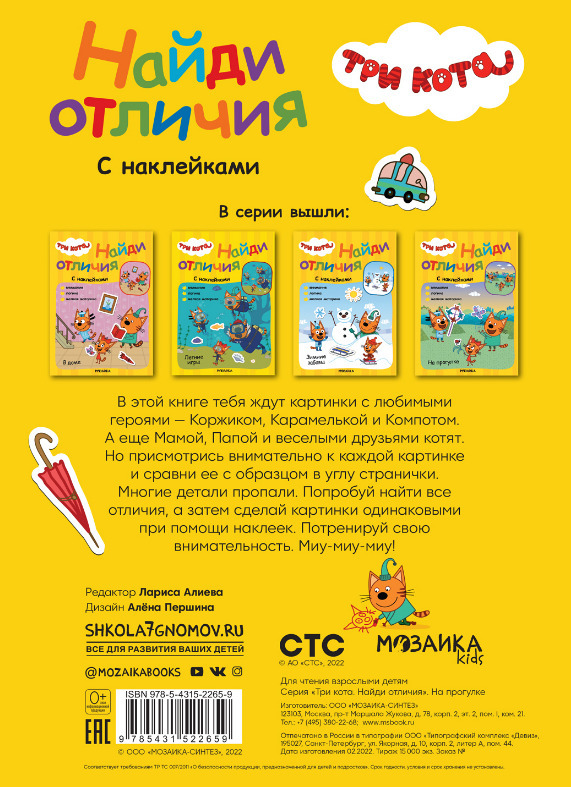 В книге «На прогулке» серии «Три кота. Найди отличия» ребенку предлагается решить увлекательные головоломки: рассмотреть внимательно картинку, сравнить ее с образцом, найти все отличия и затем сделать картинки одинаковыми с помощью наклеек. Это простая, но интересная механика не только нравится всем детям, но и развивает мелкую моторику, тренирует внимание.