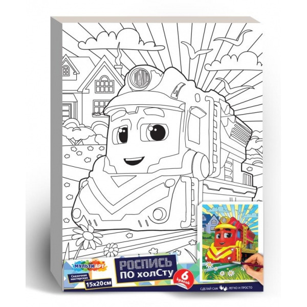 Ребёнок увлекательно и с пользой проведёт время, расписывая холст с изображением забавного паровозика. Подбирать цвета можно по собственному желанию или используя образец на упаковке. Готовая картина станет отличным вариантом для украшения интерьера комнаты или в качестве подарка, сделанного своими руками.