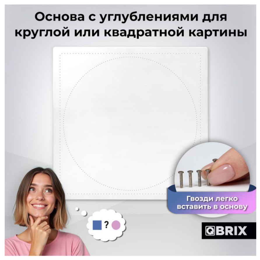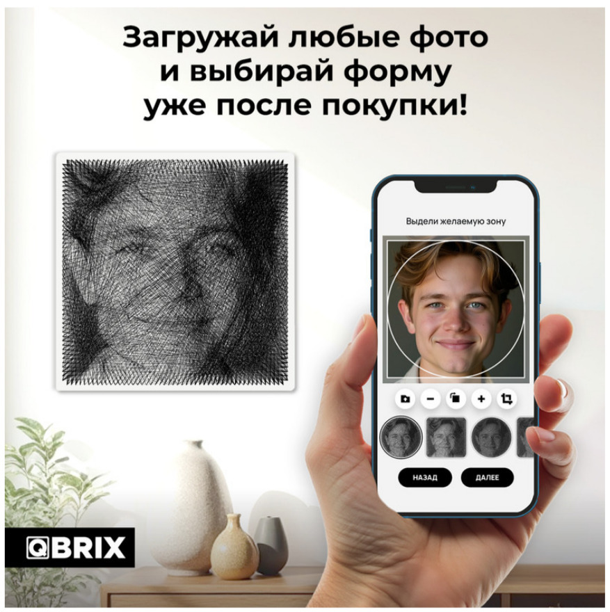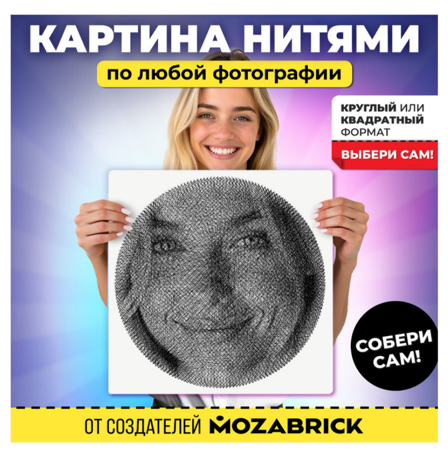 QBRIX картина нитями по любой фотографии. Это первый в мире набор, который позволяет не просто создать картину нитью своими руками, но и выбрать форму сборки: картина может быть круглой или квадратной! На основе есть прорези под гвозди, пользователь сам решает, какой формы хочет собрать картину, и вставляет гвозди (это довольно легко). Размер основы 37×37 см, все необходимое для сборки в комплекте.