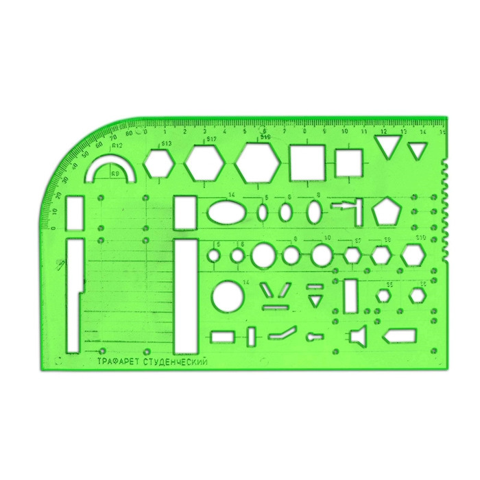 Трафарет СТАММ предназначен для студентов, выполняющих работы по построению геометрических фигур и рисованию электрических и химических схем. Содержит линейку 15 см с отливной шкалой и транспортир 90 градусов. Товар представлен в зелёном цвете.